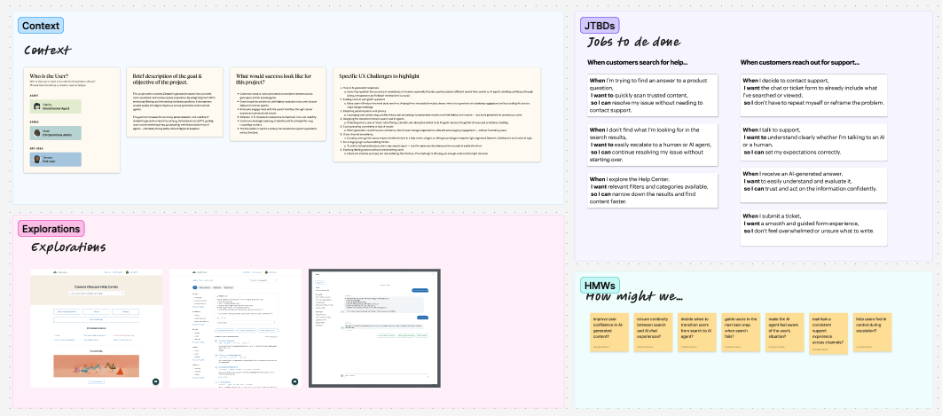 This work sat at the intersection of Knowledge, AI Agents, Messaging, and Search. I led design across discovery, concept exploration, validation, and early delivery planning, shaping both the end-user experience and the admin tooling required to make it scalable, configurable, and trustworthy.