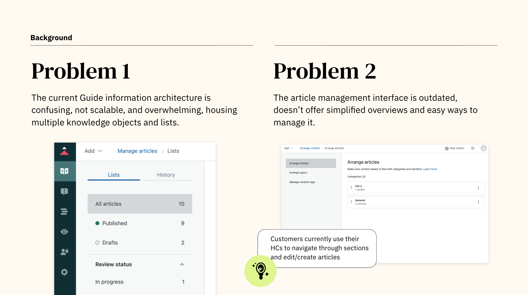 When I joined Knowledge, the team had awareness of the pain, but lacked clarity on the underlying architectural gaps. My focus was to lead a comprehensive discovery and definition effort to understand the problem, benchmark opportunities, and shape a scalable direction for knowledge management in Zendesk.