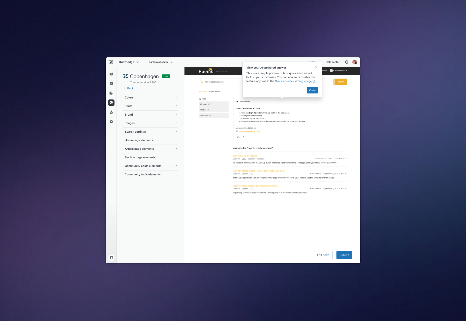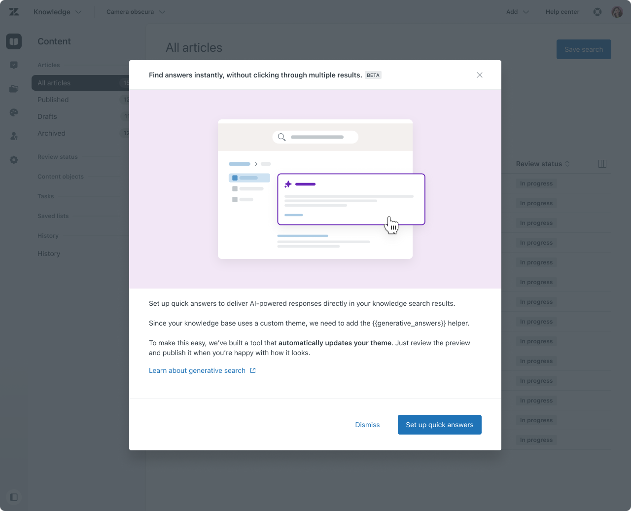 Generative Search relies on a specific helper being present in the Help Center theme. While Zendesk’s standard themes had already been updated, the majority of customers relied on custom themes that could not be automatically modified without risk.